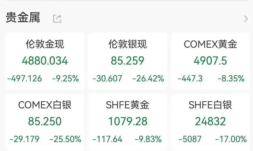 截至1月31日盘中,伦敦金现货黄金报4860美元/盎司,跌幅超9%;COMEX黄金期货报4907.5美元/盎司,跌8.35%。伦敦银白银现货报84美元/盎司,跌幅超25%;COMEX白银报85美元/盎司,跌幅超25%。